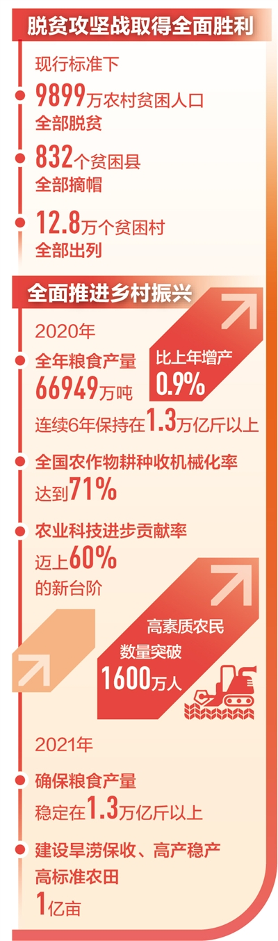 數(shù)據(jù)來源:國家統(tǒng)計局等 習近平總書記指出,脫貧摘帽不是終點,而是新生活、新奮斗的起點。代表委員表示,要切實做好鞏固拓展脫貧攻堅成果同鄉(xiāng)村振興有效銜接各項工作,以更有力的舉措、匯聚更強大的力量,促進農(nóng)業(yè)高質(zhì)高效、鄉(xiāng)村宜居宜業(yè)、農(nóng)民富裕富足。 脫貧攻堅取得勝利后,要全面推進鄉(xiāng)村振興,這是“三農(nóng)”工作重心的歷史性轉(zhuǎn)移。代表委員表示,要乘勢而上、再接再厲、接續(xù)奮斗,鞏固和拓展脫貧攻堅成果,全面推進鄉(xiāng)村振興,加快農(nóng)業(yè)農(nóng)村現(xiàn)代化,讓廣大人民群眾獲得感、幸福感、安全感更加充實、更有保障、更可持續(xù)。 讓脫貧基礎更加穩(wěn)固、成效更可持續(xù) “脫貧攻堅成果來之不易,鞏固拓展脫貧攻堅成果的各項工作要抓緊抓實?!焙颖笔§`壽縣南營鄉(xiāng)車谷砣村黨支部書記陳春芳代表說,一方面要建立健全防止返貧機制,對易返貧致貧人口加強監(jiān)測,做到早發(fā)現(xiàn)、早干預、早幫扶,堅決守住不發(fā)生規(guī)模性返貧的底線。另一方面,要建立完善產(chǎn)業(yè)、就業(yè)、教育、醫(yī)療等長效幫扶機制,讓脫貧成效更可持續(xù)。 “實現(xiàn)鞏固拓展脫貧攻堅成果同鄉(xiāng)村振興有效銜接,要抓住關鍵環(huán)節(jié)?!比珖f(xié)農(nóng)業(yè)和農(nóng)村委員會副主任陳曉華委員建議,將脫貧攻堅中形成的“中央統(tǒng)籌、省負總責、市縣抓落實”工作機制、精準施策等工作方法,運用到全面推進鄉(xiāng)村振興中來,將在鄉(xiāng)村振興中發(fā)揮重要作用。 脫貧不脫政策,摘帽不摘責任。陳春芳代表認為,5年過渡期內(nèi)要保持現(xiàn)有主要幫扶政策總體穩(wěn)定,不搞“急剎車”,并逐項分類優(yōu)化調(diào)整,逐步實現(xiàn)由集中資源支持脫貧攻堅向全面推進鄉(xiāng)村振興平穩(wěn)過渡。要抓緊出臺各項政策完善優(yōu)化的具體實施辦法,確保工作不留空檔、政策不留空白。 投入保障的有效銜接不可或缺。“全面實施鄉(xiāng)村振興戰(zhàn)略的深度、廣度、難度都不亞于脫貧攻堅,要強化農(nóng)業(yè)農(nóng)村優(yōu)先發(fā)展投入保障。”國家稅務總局福建省稅務局局長趙靜代表認為,繼續(xù)統(tǒng)籌安排一定幫扶資金,加強農(nóng)村低收入人口常態(tài)化幫扶,繼續(xù)選送優(yōu)秀干部到發(fā)展基礎薄弱村當好發(fā)展帶頭人。近年來,福建稅務部門累計下派駐村稅務干部142人,投入扶貧資金1.77億元。 讓脫貧基礎更穩(wěn)固,離不開產(chǎn)業(yè)高質(zhì)量發(fā)展?!皩γ撠毜貐^(qū)的產(chǎn)業(yè)要長期培育和支持,促進產(chǎn)業(yè)可持續(xù)發(fā)展,為農(nóng)民增收提供持久動能?!敝貞c市涪陵區(qū)南沱鎮(zhèn)睦和村黨支部書記劉家奇代表說,乘著好政策東風,睦和村變成四季花果飄香的生態(tài)旅游村。下一步要補上技術、設施、營銷等短板,促進農(nóng)業(yè)、旅游、文化等產(chǎn)業(yè)融合發(fā)展,久久為功做大做強鄉(xiāng)村產(chǎn)業(yè)。 走中國特色社會主義鄉(xiāng)村振興道路 民族要復興,鄉(xiāng)村必振興。代表委員認為,“十四五”時期,要圍繞立足新發(fā)展階段、貫徹新發(fā)展理念、構建新發(fā)展格局帶來的新形勢、提出的新要求,扎實做好新發(fā)展階段“三農(nóng)”工作,促進農(nóng)業(yè)高質(zhì)高效、鄉(xiāng)村宜居宜業(yè)、農(nóng)民富裕富足。 解決好發(fā)展不平衡不充分問題,迫切需要補齊農(nóng)業(yè)農(nóng)村短板弱項,推動城鄉(xiāng)協(xié)調(diào)發(fā)展。中國工程院院士、河南農(nóng)業(yè)大學校長張改平委員說,必須堅持農(nóng)業(yè)農(nóng)村優(yōu)先發(fā)展,走中國特色社會主義鄉(xiāng)村振興道路,持續(xù)縮小城鄉(xiāng)區(qū)域發(fā)展差距,讓低收入人口和欠發(fā)達地區(qū)共享發(fā)展成果,在現(xiàn)代化進程中不掉隊、趕上來。 “為推動城鄉(xiāng)協(xié)調(diào)發(fā)展,近年來海西州持續(xù)開展‘高原美麗鄉(xiāng)村’城鄉(xiāng)一體化示范點及基礎設施建設,在村容村貌整治、村莊道路硬化等方面逐步補上短板?!鼻嗪J『N髅晒抛宀刈遄灾沃菸睍洝⒅蓍L孟海代表介紹。 構建新發(fā)展格局,潛力后勁在“三農(nóng)”。“農(nóng)村市場潛力巨大,擴大農(nóng)村需求大有可為?!眲⒓移娲碚f,如今村里的基礎設施完善了,農(nóng)民腰包鼓了,不少家庭都買了小汽車,網(wǎng)購成了新時尚,外出旅游的也越來越多。張改平委員表示,實施鄉(xiāng)村振興戰(zhàn)略,會釋放巨大的農(nóng)村消費和投資需求,為構建新發(fā)展格局提供強大支撐。 應對國內(nèi)外各種風險挑戰(zhàn),需要穩(wěn)住農(nóng)業(yè)基本盤。陳曉華委員表示,有效化解各類風險,要提升糧食和重要農(nóng)產(chǎn)品供給保障能力。各地各部門要立足自身抓好農(nóng)業(yè)生產(chǎn),以國內(nèi)穩(wěn)產(chǎn)保供的確定性來應對外部環(huán)境的不確定性。 讓廣大農(nóng)民過上更加美好的生活 新發(fā)展階段,“三農(nóng)”工作依然極端重要,須臾不可放松,務必抓緊抓實。代表委員認為,把全面推進鄉(xiāng)村振興作為實現(xiàn)中華民族偉大復興的一項重大任務,舉全黨全社會之力加快農(nóng)業(yè)農(nóng)村現(xiàn)代化,一定能讓廣大農(nóng)民過