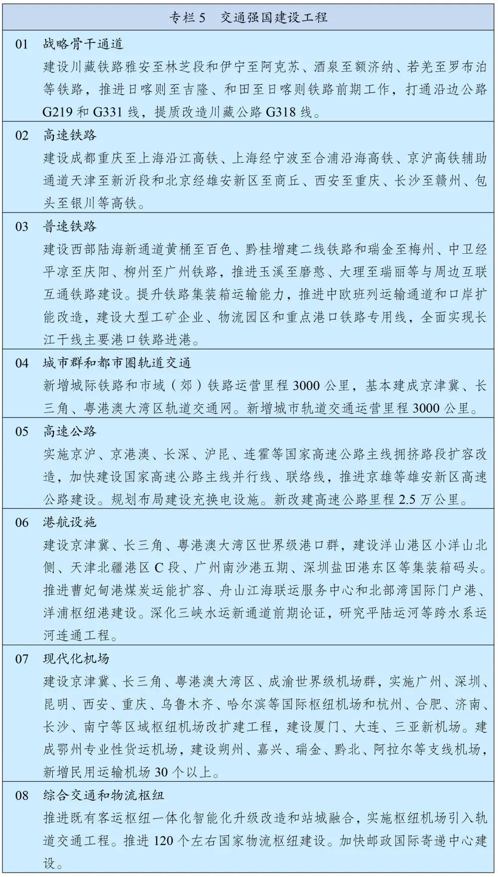 前瞻布局6G網(wǎng)絡(luò)技術(shù)儲(chǔ)備。 擴(kuò)容骨干網(wǎng)互聯(lián)節(jié)點(diǎn),新設(shè)一批國(guó)際通信出入口,全面推進(jìn)互聯(lián)網(wǎng)協(xié)議第六版(IPv6)商用部署。 實(shí)施中西部地區(qū)中小城市基礎(chǔ)網(wǎng)絡(luò)完善工程。 推動(dòng)物聯(lián)網(wǎng)全面發(fā)展,打造支持固移融合、寬窄結(jié)合的物聯(lián)接入能力。 建設(shè)若干國(guó)家樞紐節(jié)點(diǎn)和大數(shù)據(jù)中心集群,建設(shè)E級(jí)和10E級(jí)超級(jí)計(jì)算中心。 積極穩(wěn)妥發(fā)展工業(yè)互聯(lián)網(wǎng)和車聯(lián)網(wǎng)。 打造全球覆蓋、高效運(yùn)行的通信、導(dǎo)航、遙感空間基礎(chǔ)設(shè)施體系,建設(shè)商業(yè)航天發(fā)射場(chǎng)。 加快交通、能源、市政等傳統(tǒng)基礎(chǔ)設(shè)施數(shù)字化改造,加強(qiáng)泛在感知、終端聯(lián)網(wǎng)、智能調(diào)度體系建設(shè)。 打通多元化投資渠道,構(gòu)建新型基礎(chǔ)設(shè)施標(biāo)準(zhǔn)體系。 交通強(qiáng)國(guó)建設(shè)工程 加強(qiáng)出疆入藏、中西部地區(qū)、沿江沿海沿邊戰(zhàn)略骨干通道建設(shè),加強(qiáng)與周邊國(guó)家互聯(lián)互通。 構(gòu)建快速網(wǎng),基本貫通“八縱八橫”高速鐵路,提升國(guó)家高速公路網(wǎng)絡(luò)質(zhì)量,加快建設(shè)世界級(jí)港口群和機(jī)場(chǎng)群。