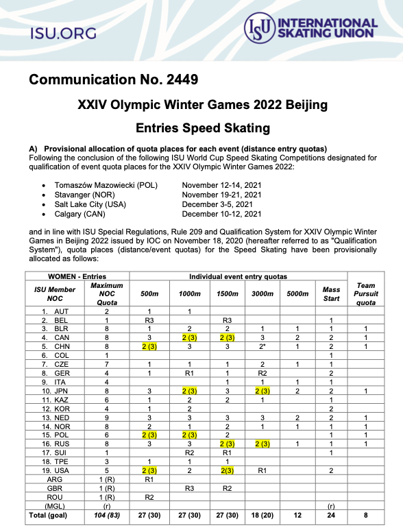 北京冬奧會速度滑冰女子項目席位分配情況。圖/國際滑聯(lián)官網 速度滑冰女子項目分為500米、1000米、1500米、3000米、5000米、集體出發(fā)以及團體追逐7個小項,共有104個參賽席位,速度滑冰項目的霸主荷蘭隊拿到全部17個席位。4站世界杯,中國速度滑冰女隊表現不俗,總計斬獲14個席位,實現全項目參賽,其中1000米、1500米、集體出發(fā)3個小項拿到滿額參賽席位。