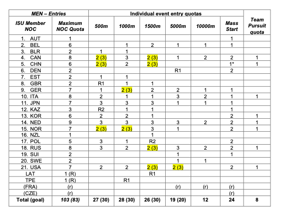 北京冬奧會速度滑冰男子項目席位分配情況。圖/國際滑聯(lián)官網 速度滑冰男子項目分為500米、1000米、1500米、5000米、10000米、集體出發(fā)以及團體追逐7個小項,共有103個參賽席位,荷蘭速度滑冰男隊同樣拿滿17個席位。除了5000米、10000米兩個長距離項目,中國速度滑冰男隊拿到其余5個小項的參賽資格,總計8個參賽席位。 據國際滑聯(lián)介紹,北京冬奧會速度滑冰項目的參賽席位并未最終確定。以中國速度滑冰隊為例,在女子500米、5000米以及男子500米、1500米4個小項上,由于順位靠前,如果有其他隊伍的運動員無法參賽,中國運動員仍有機會遞補參賽。 此外,國家體育總局冬季運動管理中心今天發(fā)布公告,經研究決定,寧忠?guī)r、高亭宇兩位中國男子速滑名將已經獲得北京冬奧會參賽資格。結合國際滑聯(lián)公布的參賽席位,其余4名男運動員、8名女運動員將通過中國速度滑冰隊的內部選拔產生。 北京冬奧會中國速度滑冰隊參賽席位 女子:500米(2個)、1000米(3個)、1500米(3個)、3000米(2個)、5000米(1個)、集體出發(fā)(2個)、團體追逐(1個) 男子:500米(2個)、1000米(2個)、1500米(2個)、集體出發(fā)(1個)、團體追逐(1個) 新京報記者 徐邦印 |