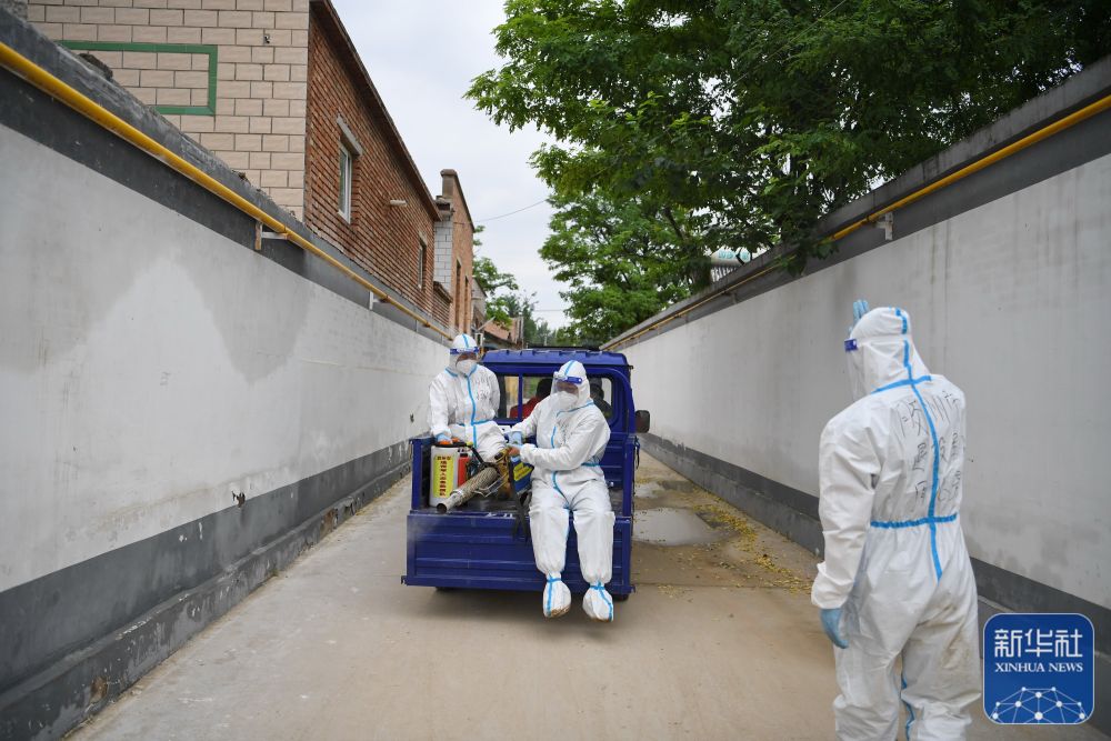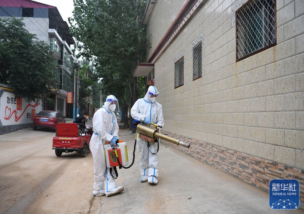 ↑8月6日,在河北省涿州市刁窩鎮(zhèn)白塔村,防疫人員在進行道路消殺作業(yè)。