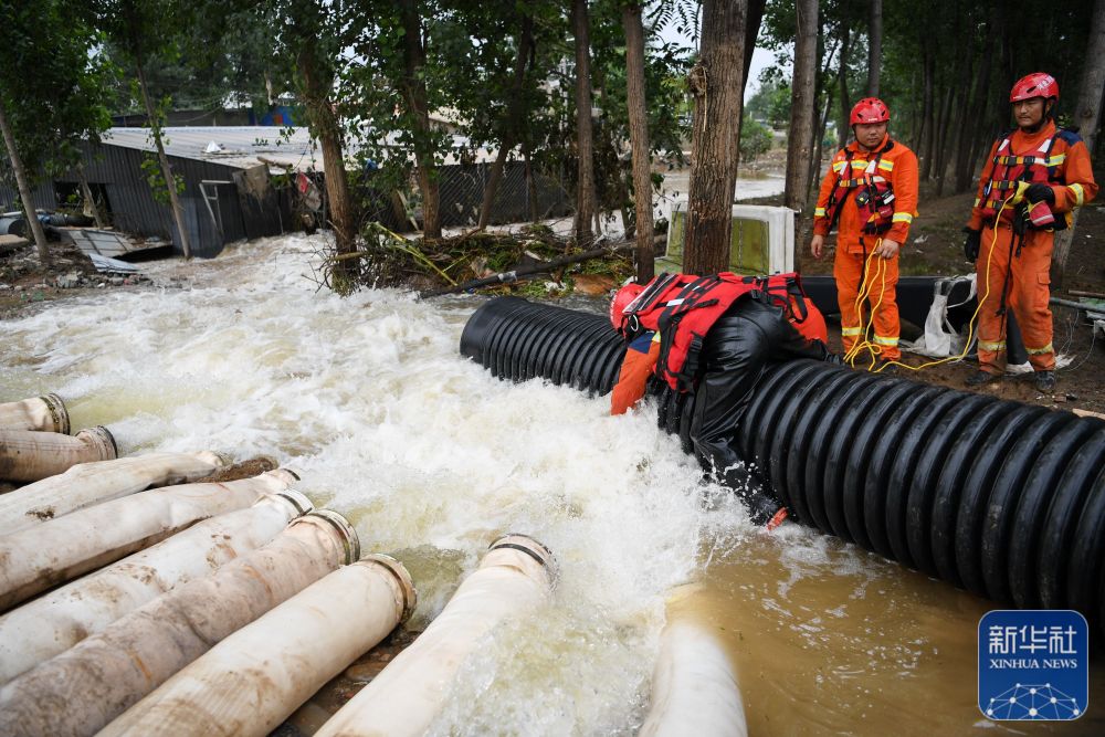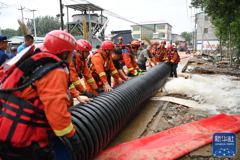 ↑8月6日,在河北省涿州市刁窩鎮(zhèn)東張村,唐山消防救援支隊隊員在進行排澇作業(yè)。