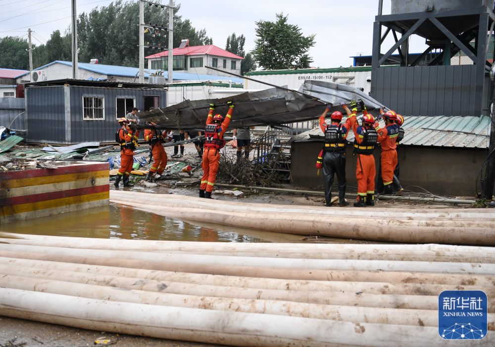 ↑8月6日,在河北省涿州市刁窩鎮(zhèn)東張村,唐山消防救援支隊隊員在清除影響排澇作業(yè)的障礙物。