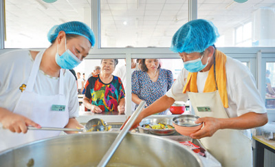 8月6日,河北省獻(xiàn)縣段村鎮(zhèn)段村中學(xué)安置點(diǎn),群眾在排隊(duì)取餐。 本報記者 陳 斌攝