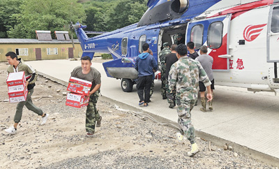 8月6日,黑龍江省應(yīng)急管理廳調(diào)派直升機(jī)向受災(zāi)地區(qū)運(yùn)送救援物資。 劉溫馨 段紅偉攝影報道