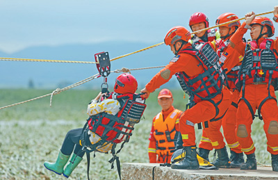 8月5日,吉林省舒蘭市七里鄉(xiāng)三合村,吉林市森林消防支隊(duì)隊(duì)員在利用繩索救援受困群眾。 孟海鷹 薛二濤攝影報道