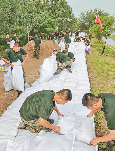 日前,天津市靜海區(qū)臺頭鎮(zhèn)大清河南岸,武警天津總隊(duì)官兵在加固堤壩。 武警天津總隊(duì)供圖