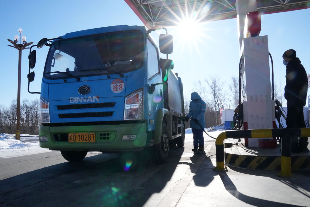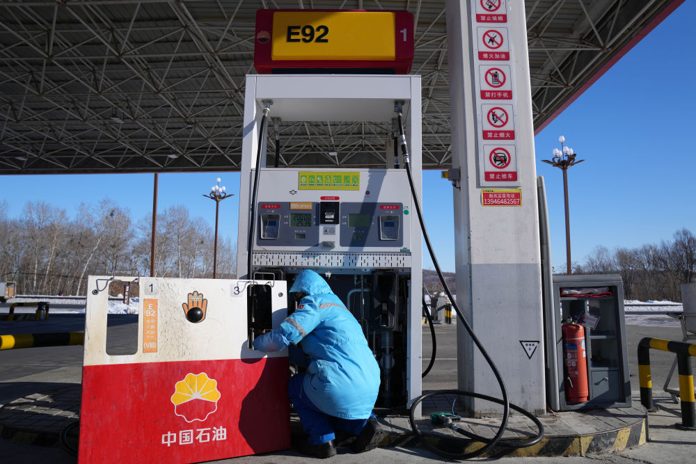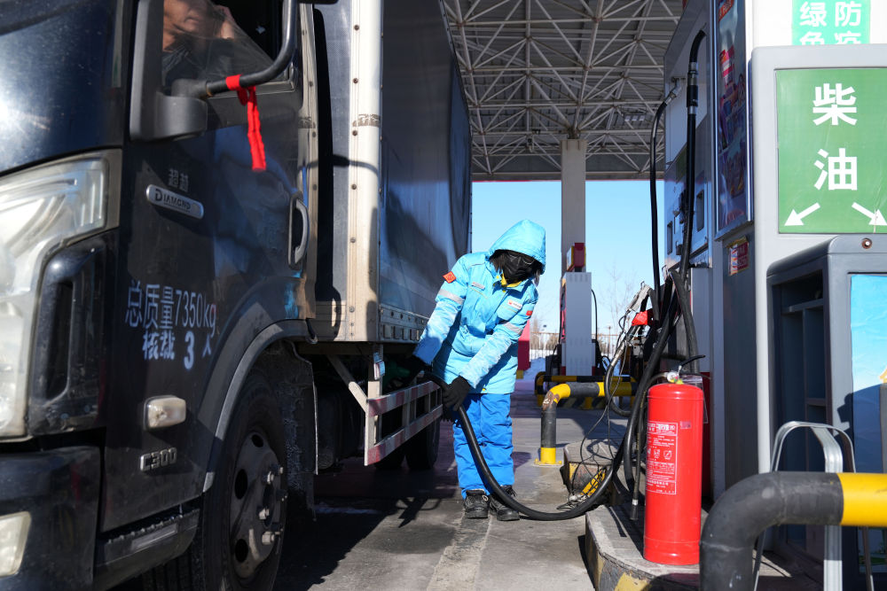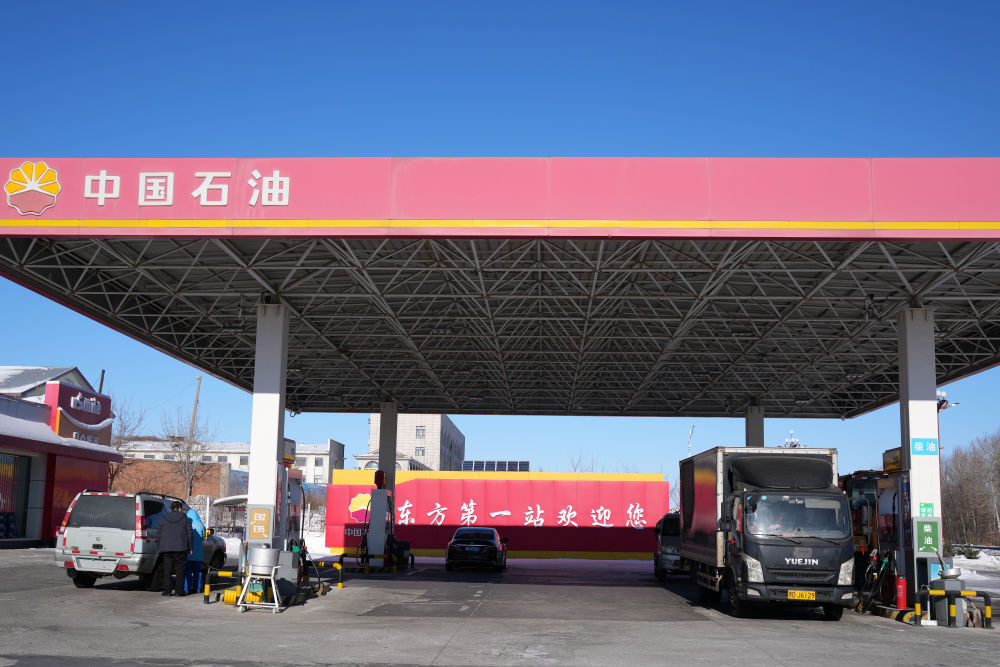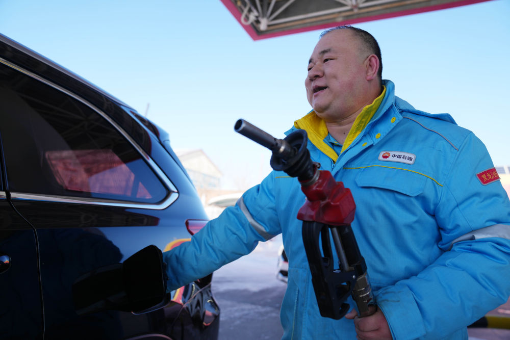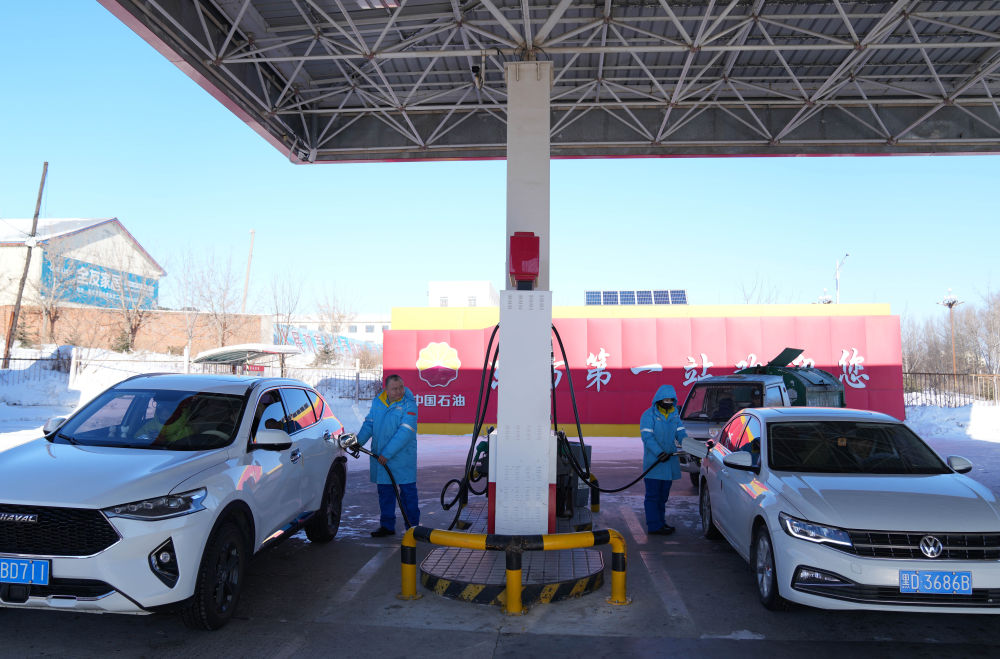 2月2日,中石油黑龍江撫遠(yuǎn)東方第一加油站的員工給車輛加油。