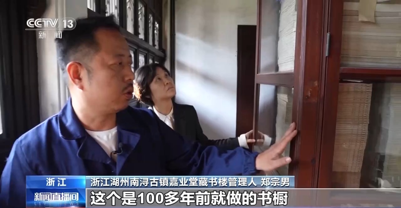 浙江湖州南潯古鎮(zhèn)嘉業(yè)堂藏書樓管理人鄭宗男:嘉業(yè)藏書樓最重要的一項工作就是古籍保護,這個是100多年前就做的書櫥,用的材質(zhì)是防蟲效果非常好的柚木。窗戶有兩扇,外面是白鐵皮,避免陽光對書籍的直射。江南地區(qū)比較潮濕,怎么防范對書籍造成的破壞?像太陽剛剛升起的時候,上午就打開西廂房的窗戶,等到午后再把東廂房的窗戶打開,這樣既可以讓書本得到一個順暢的呼吸,又避免遭到陽光的直射。