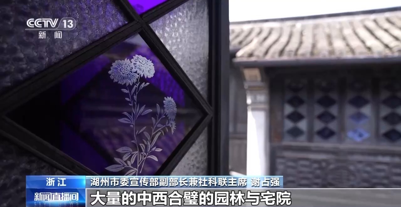 像這樣中西合璧的百年建筑,是南潯古鎮(zhèn)建筑的獨有特色。這些建筑既引入西方建筑的元素,又傳承了中國古典人文精神。這棟傳統(tǒng)中式房屋的窗戶玻璃,鑲嵌的是法國進口的藍晶玻璃,上面定制的圖案卻是中國的花卉、瓜果等。