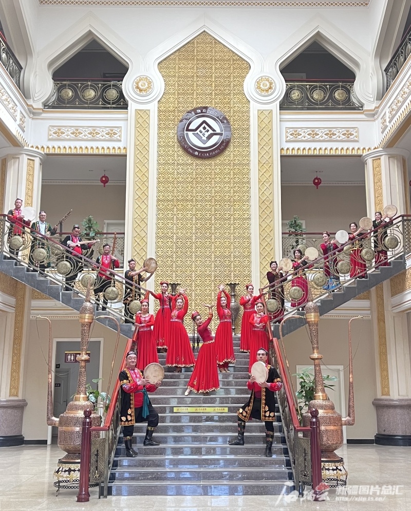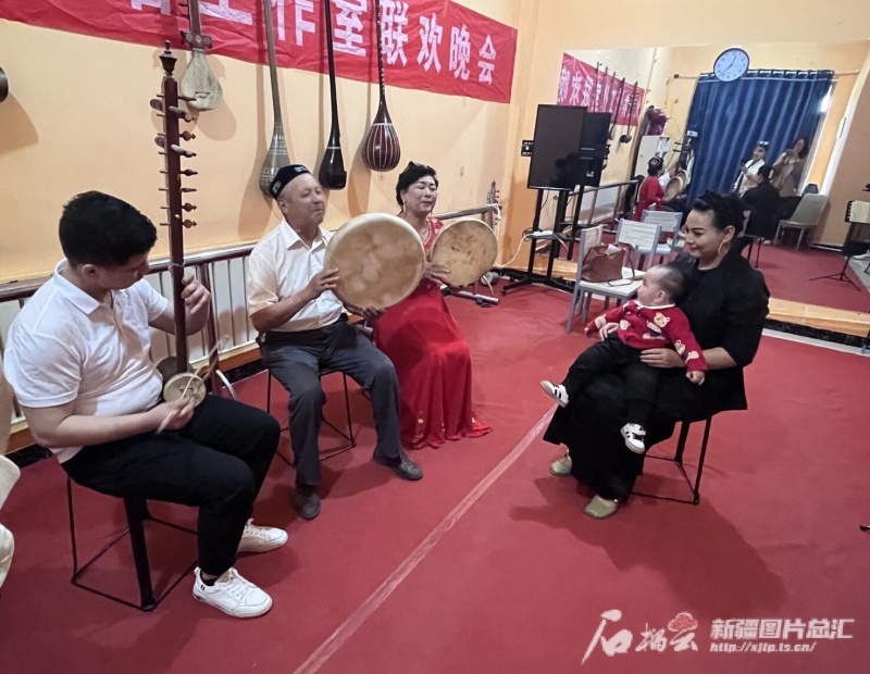 在哈密市非物質(zhì)文化遺產(chǎn)保護(hù)中心,回城鄉(xiāng)的傳承人們和當(dāng)?shù)匮輪T進(jìn)行哈密木卡姆表演。石榴云/新疆日?qǐng)?bào)記者 王晶晶攝 棗然木和女兒、女婿都是哈密木卡姆項(xiàng)目代表性傳承人,她的老伴賽買(mǎi)提·艾力木是納格拉鼓哈密市級(jí)代表性傳承人。像這樣一家有好幾位非遺傳承人的家庭,在回城鄉(xiāng)并不是個(gè)例。 位于哈密市近郊、只有8900多人的回城鄉(xiāng),擁有34個(gè)非遺項(xiàng)目、194位各級(jí)非遺傳承人。其中,自治區(qū)級(jí)代表性傳承人1人,哈密市級(jí)代表性傳承人24人?!拔覀儼凑辗沁z項(xiàng)目分類(lèi),給每個(gè)傳承人建立檔案,記錄他們的譜系、技藝水平和傳承情況。鄉(xiāng)里根據(jù)大家的不同需求,推薦他們參加相關(guān)非遺項(xiàng)目培訓(xùn),也鼓勵(lì)傳承人們走出去演出?!被爻青l(xiāng)副鄉(xiāng)長(zhǎng)王雪姣說(shuō)。
