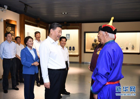 2019年7月15日,習(xí)近平總書(shū)記在赤峰博物館同古典民族史詩(shī)《格薩(斯)爾》非物質(zhì)文化遺產(chǎn)傳承人親切交談。