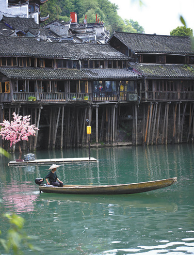 湖南湘西土家族苗族自治州鳳凰古城的吊腳樓沿沱江而建,鱗次櫛比,錯(cuò)落有致。古色古香的建筑通風(fēng)防潮,避暑御寒,極具工藝審美和文物研究?jī)r(jià)值。圖為鳳凰古城吊腳樓一瞥。 俄羅斯籍游客 魯?shù)履贰に緥I娜攝