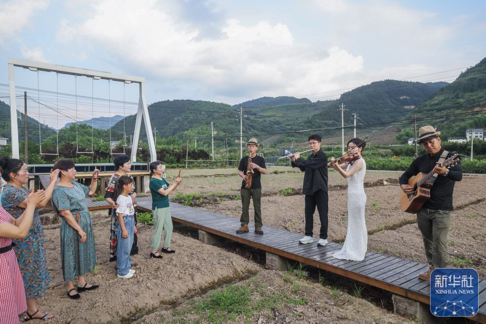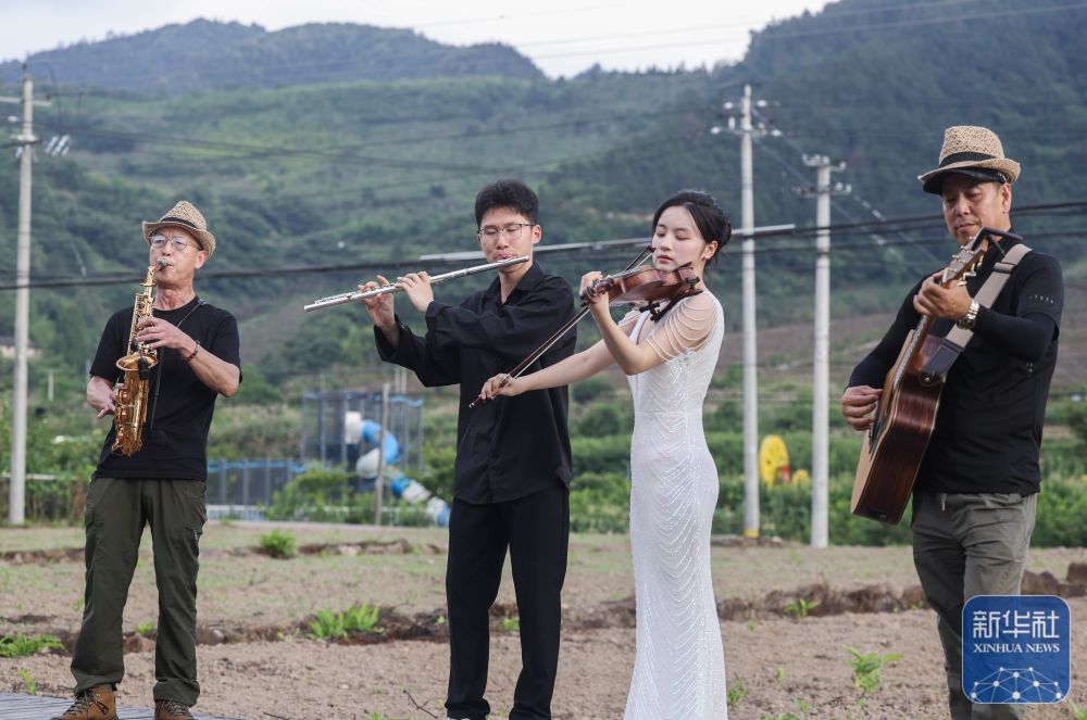 6月15日,三都鎮(zhèn)鎮(zhèn)頭村的村民樂隊樂手和杭州師范大學音樂學院的學生(右二、右三)在田間為村民即興演出。