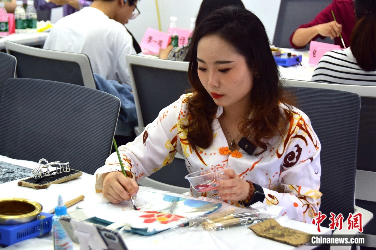 “先用鉛筆把圖案描繪出來,最主要的環(huán)節(jié)是用蠟刀蘸取蠟液,描繪它的邊框……”馬來西亞留學(xué)生謝愷恩為同學(xué)們演示如何制作馬來西亞蠟染,只見她一邊講解,一邊嫻熟地勾繪圖案、染色,不一會兒鮮艷的花朵圖案便于布料上“綻放”。