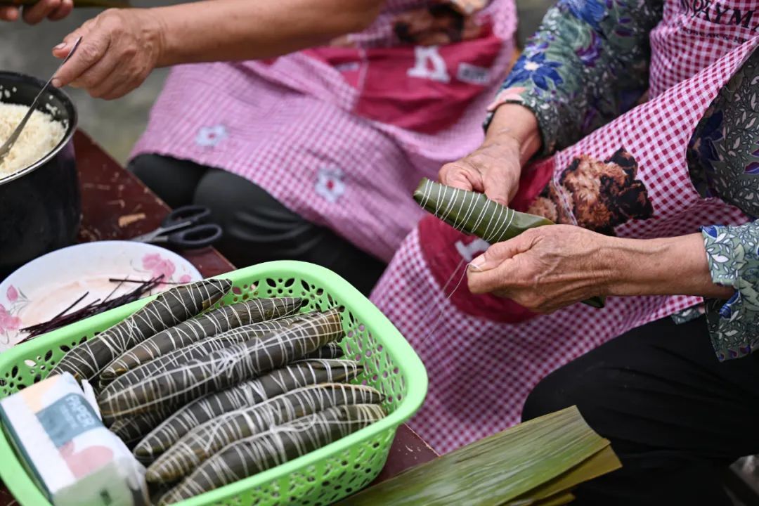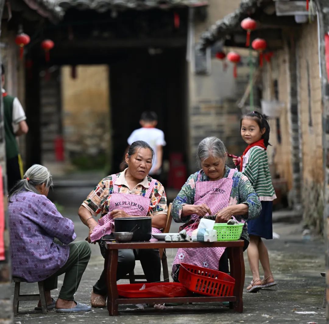 時(shí)光在古村內(nèi)的石板路上流淌。 沿著回廊巷道進(jìn)入古建筑群院落內(nèi),只見幾位閑聊正歡的大姐和阿婆正在包粽子,這是當(dāng)?shù)囟宋绻?jié)特有的儀式感。她們包的粽子當(dāng)?shù)厝私袥鲷?,又稱灰水粽。見到客人來(lái)訪,她們熱情招呼著一起吃粽子,軟糯的粽子蘸上蜂蜜或白糖,和生活一樣甜。 端午時(shí)節(jié),粽香陣陣,只見她們手法嫻熟,談笑間,粽葉在她們手中翻飛、收攏,捆扎勻稱。粽葉的清香和古建筑的古色古香,以及散學(xué)歸來(lái)的孩童的歡聲陣陣,為端午這個(gè)傳統(tǒng)節(jié)日增添了幾分溫馨與熱鬧。
