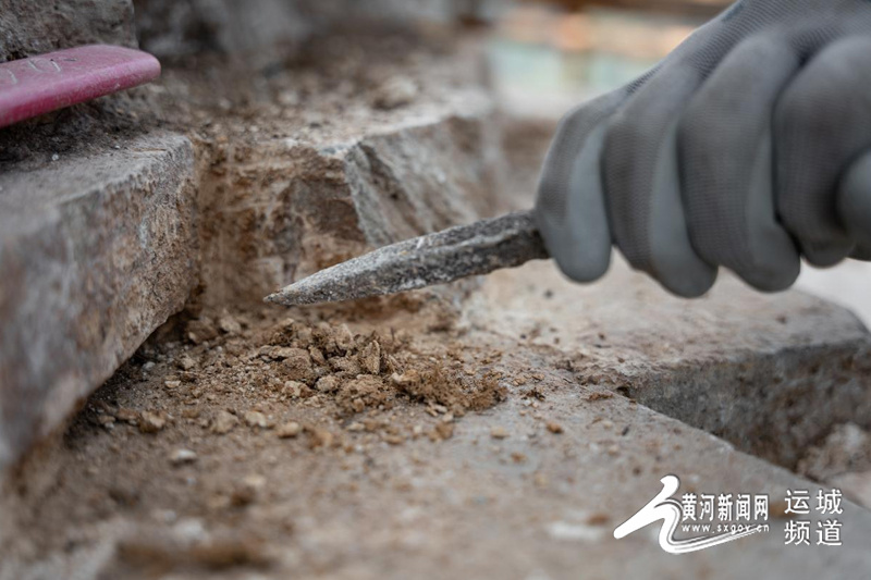 工匠在認(rèn)真填補(bǔ)磚縫。蘭立強(qiáng) 攝 “勘察記錄、制定方案、表面清理、縫隙處理、部位修復(fù)、加固防護(hù)、表面涂層……”楊志杰告訴記者,修繕千年古建的原則是要確?!靶夼f如舊、建新如故”,所以修繕時的工序很復(fù)雜。 談話間,記者看到,在烈日的炙烤下,工匠們的額頭布滿了豆大的汗珠,汗水順著臉頰不住地滑落,折射出晶瑩的光芒。他們正使用特制的工具,小心翼翼地填補(bǔ)著墻體上的裂縫,“每一處填補(bǔ)的材料都經(jīng)過精心調(diào)配,竭力追求與原有墻體的材質(zhì)和色澤完美融合?!?/p> 修繕現(xiàn)場,各種聲音不絕于耳。工匠們手中的工具相互碰撞發(fā)出清脆的聲響,指揮人員為確保施工安全與質(zhì)量不時發(fā)出洪亮的呼喊聲,還有材料運(yùn)輸時產(chǎn)生的摩擦聲,相互交織融合,宛如一首激昂奮進(jìn)的交響曲,在這片古老的土地上久久回蕩。