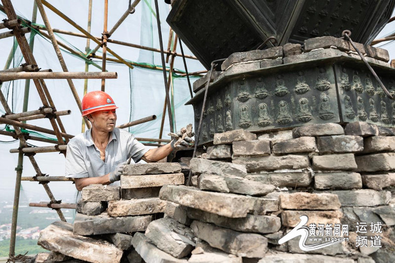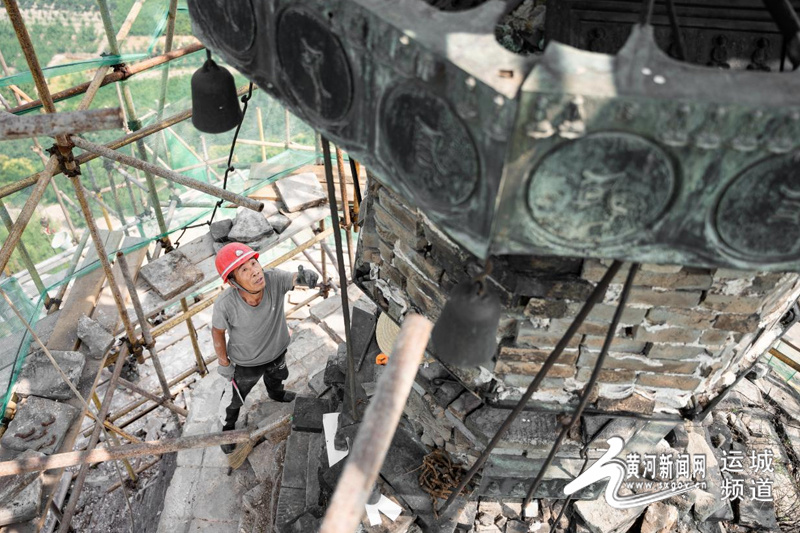 修繕中的多寶塔。蘭立強(qiáng) 攝 塔頂?shù)奈L(fēng)輕輕拂過,工匠們的衣角隨風(fēng)飄動。他們的臉上雖淌滿汗水、寫滿疲憊,但眼神中卻透露出執(zhí)著。在他們身后,是遼闊無垠的天空和連綿起伏的中條山脈,仿佛在默默見證著這場與時間賽跑的修繕之旅。
