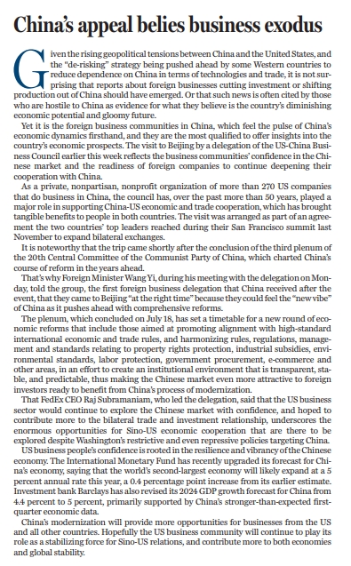 一段時間以來,中美之間的地緣政治緊張態(tài)勢有所加劇,一些西方國家打著“去風(fēng)險”政策的旗號,在科技與貿(mào)易領(lǐng)域推行所謂“減少對中國依賴”的做法,“外企停止在華投資生產(chǎn)”的相關(guān)報道也由此產(chǎn)生,這些報道更是經(jīng)常被一些敵視中國的勢力所引用,作為他們眼里“中國經(jīng)濟潛力不再、前景堪憂”的證據(jù)。 但在華的外企們想必都能切身感受到當(dāng)下中國經(jīng)濟跳動的脈搏,也更有資格對中國經(jīng)濟前景分享見解。本周早些時候,美中貿(mào)易全國委員會代表團(tuán)來訪北京,此行毫無疑問就展現(xiàn)了商界對中國市場的信心,也展現(xiàn)出外企們對繼續(xù)深化與華合作的意愿。 美中貿(mào)易全國委員會是一家非黨派、非盈利性質(zhì)的美國民間對華貿(mào)易組織,擁有超270家在中國經(jīng)商的美國公司會員,該委員會成立逾50年來,在支持中美經(jīng)貿(mào)合作方面發(fā)揮了重要的作用,為兩國人民帶來了實實在在的利益。此次美中貿(mào)易全國委員會代表團(tuán)來華訪問,也是兩國最高領(lǐng)導(dǎo)人去年11月在舊金山峰會上達(dá)成的擴大雙邊交流協(xié)議的一部分。 值得關(guān)注的是,在美中貿(mào)易全國委員會代表團(tuán)來華前夕,黨的二十屆三中全會剛剛勝利閉幕。本次全會的召開,為中國未來的改革指明了方向。 對此,中共中央政治局委員、外交部長王毅在會見該代表團(tuán)時就表示:“你們是全會后首個來訪的美國工商界代表團(tuán),可在第一時間感知中國進(jìn)一步全面深化改革的新氣象,可以說來得恰逢其時。” 7月18日,黨的二十屆三中全會在北京勝利閉幕。全會為中國新一輪經(jīng)濟改革制定了“時間表”。改革任務(wù)中就包括了旨在推動與國際高標(biāo)準(zhǔn)經(jīng)貿(mào)規(guī)則對接,在產(chǎn)權(quán)保護(hù)、產(chǎn)業(yè)補貼、環(huán)境標(biāo)準(zhǔn)、勞動保護(hù)、政府采購、電子商務(wù)等領(lǐng)域?qū)崿F(xiàn)規(guī)則、規(guī)制、管理、標(biāo)準(zhǔn)相通相容,以打造透明穩(wěn)定可預(yù)期的制度環(huán)境等內(nèi)容。 這些深化改革的舉措,讓中國市場更顯“魅力十足”,也讓眾多“躍躍欲試”的外國投資者,有機會進(jìn)一步分享到中國現(xiàn)代化發(fā)展進(jìn)程所帶來的紅利。 本次率代表團(tuán)來華的美中貿(mào)易全國委員會董事會主席、美國聯(lián)邦快遞集團(tuán)總裁兼首席執(zhí)行官芮思博就表示,美國企業(yè)界對繼續(xù)深耕中國市場充滿信心,并希望為雙邊貿(mào)易和投資關(guān)系作出更大貢獻(xiàn)。這也凸顯出盡管華盛頓方面對中國持續(xù)進(jìn)行限制甚至打壓,但中美經(jīng)濟合作始終空間巨大,尚有無數(shù)機遇等待探索。 美國企業(yè)家們對中國經(jīng)濟的信心,源自于中國經(jīng)濟自身的強大韌性和活力。國際貨幣基金組織(IMF)近期就上調(diào)了對今年中國經(jīng)濟增長的預(yù)期。IMF表示,作為世界第二大經(jīng)濟體的中國,2024年經(jīng)濟的增速有望達(dá)到5%,較早先的預(yù)期上調(diào)0.4個百分點。無獨有偶,中國今年一季度超預(yù)期的強勁經(jīng)濟數(shù)據(jù),也令巴克萊銀行將對2024年中國GDP增長速度的預(yù)測從此前的4.4%上調(diào)到了5%。 展望未來,中國持續(xù)推進(jìn)現(xiàn)代化建設(shè),將為包括美國在內(nèi)的各國企業(yè)提供更多機遇,也希望美國工商界繼續(xù)發(fā)揮穩(wěn)定中美關(guān)系的作用,為兩國經(jīng)濟發(fā)展和世界穩(wěn)定作出更多貢獻(xiàn)。