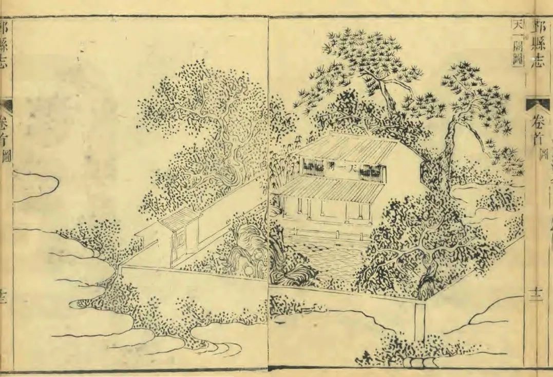 △清乾隆時(shí)期的《鄞縣志》卷首木刻的《天一閣圖》 天一閣的名字 取自《周易》中的 “天一生水,地六成之”