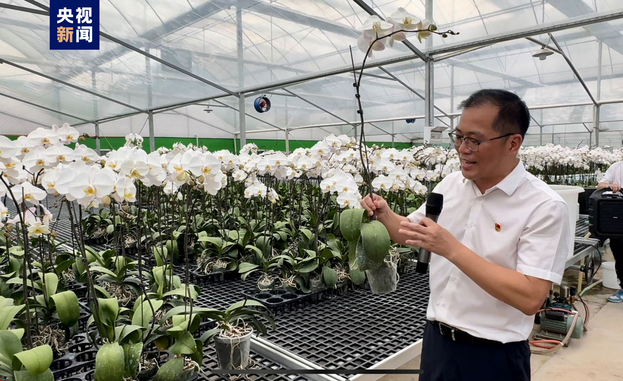 △龍?zhí)舵?zhèn)黨委書記吳才開介紹蝴蝶蘭智能溫室大棚 龍?zhí)舵?zhèn)黨委書記吳才開介紹,隨著整個龍?zhí)舵?zhèn)興起蝴蝶蘭熱,電商、運輸?shù)犬a業(yè)也同步發(fā)展,還延伸出花盆、包裝等上下游產業(yè),帶動近2000人在產業(yè)鏈就業(yè)。年人均收入達4萬元以上,年增加收入近8000萬元。