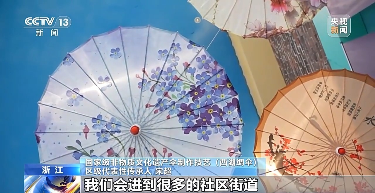國家級非物質文化遺產(chǎn)傘制作技藝(西湖綢傘)區(qū)級代表性傳承人 宋超:我們會進到很多的社區(qū)街道,我們會進到中小學的校園、博物館、非遺展示館等等這樣的地方,去進行我們西湖綢傘技藝的展示展覽,包括各種各樣的體驗活動,以此讓更多人了解和認識到我們西湖綢傘這項技藝。