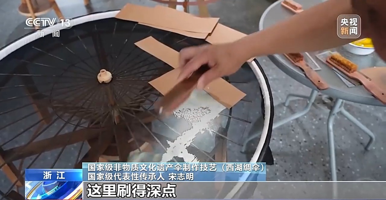 國家級非物質文化遺產(chǎn)傘制作技藝(西湖綢傘)國家級代表性傳承人 宋志明:刷出來的圖案有靈動感,這是其他噴繪、繪畫所出不來的效果,特別是在絲綢傘面上來畫,通過顏料的霧狀,刷花呈現(xiàn)的效果是獨一無二的。