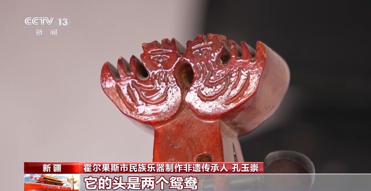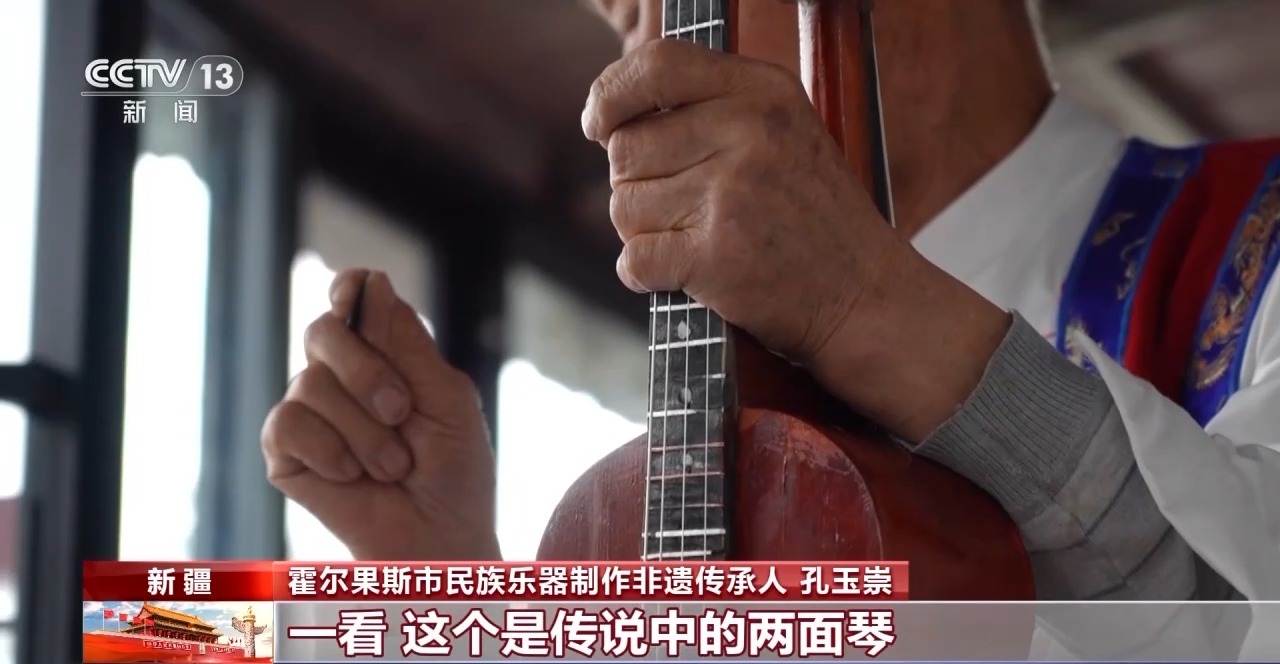 霍爾果斯市民族樂器制作非遺傳承人 孔玉崇:老人畫了一個(gè)圖,他問我,這樣的一個(gè)琴你能不能做。我一看,這個(gè)是傳說中的兩面琴,我說我做,就這樣開始了。 2005年,在吸收借鑒錫伯族傳統(tǒng)樂器和西洋樂器優(yōu)點(diǎn)的基礎(chǔ)上,孔玉崇成功研制出鴛鴦琴,這是世界上獨(dú)一無二的琴,一面拉弦,一面彈撥。