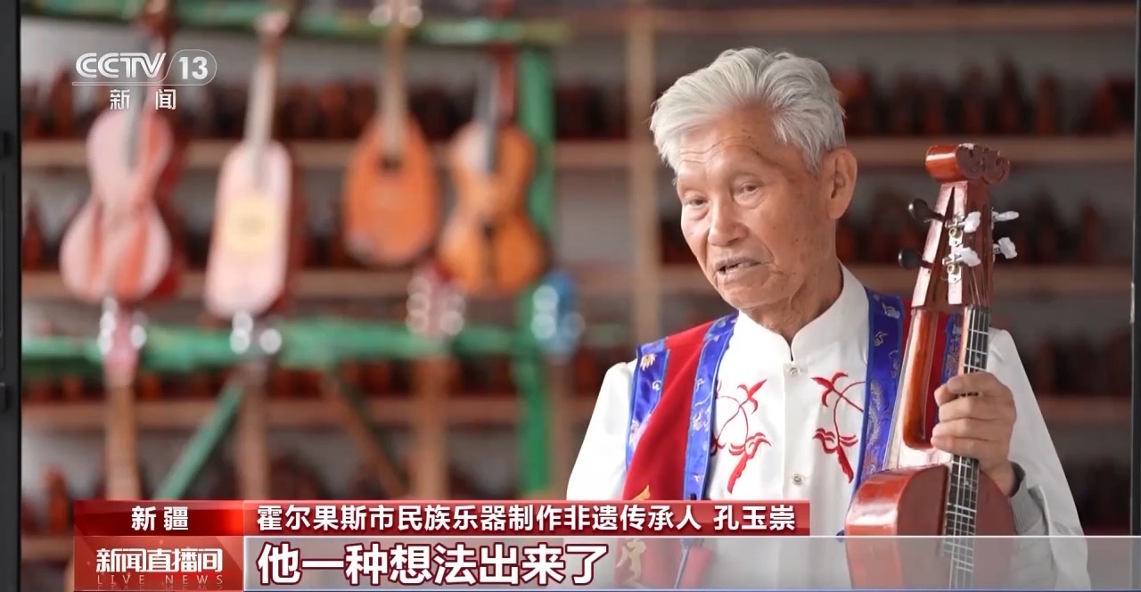 霍爾果斯市民族樂器制作非遺傳承人 孔玉崇:鴛鴦是很美好的,它有兩個(gè)腹板,也可以互為背板。它的頭是兩個(gè)鴛鴦,在一個(gè)腿上可以彈,坐著也可以拉,很方便。你帶著這么一把琴就等于帶了兩把琴,因?yàn)樗囊灿?,彈的也有?/p> 今年83歲的孔玉崇,退休前是霍爾果斯伊車嘎善鄉(xiāng)小學(xué)的一名教師,從小就癡迷于各種樂器的演奏和制作。老人說,在他懵懂的少年時(shí)代,就一直聽到當(dāng)?shù)赜幸粋€(gè)關(guān)于鴛鴦琴的傳說。