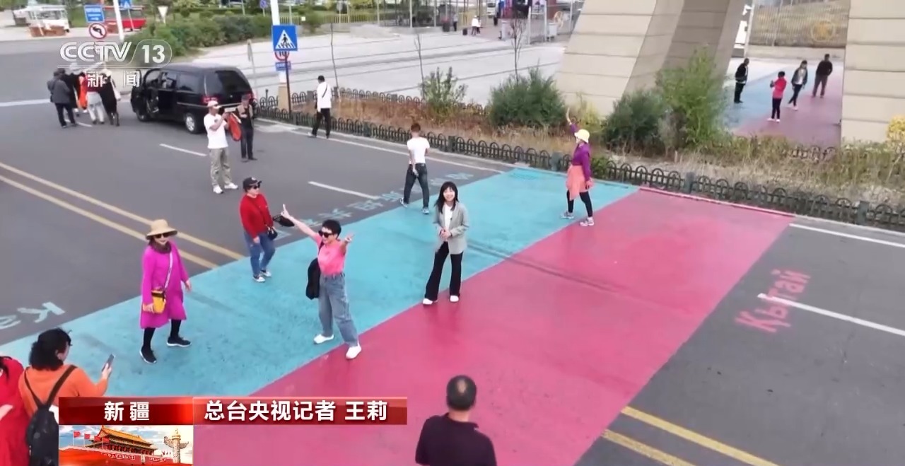 總臺(tái)央視記者 王莉:進(jìn)入合作中心,中哈連接通道處的“一步跨兩國”,絕對(duì)是游客的打卡首選地。紅色和藍(lán)色交界的地方,就是國界線了,線的一側(cè)紅色區(qū)域代表中國,藍(lán)色區(qū)域代表哈薩克斯坦。前一秒還在中國,只要一腳邁過分界線,就能一秒“出國”,來到哈薩克斯坦。