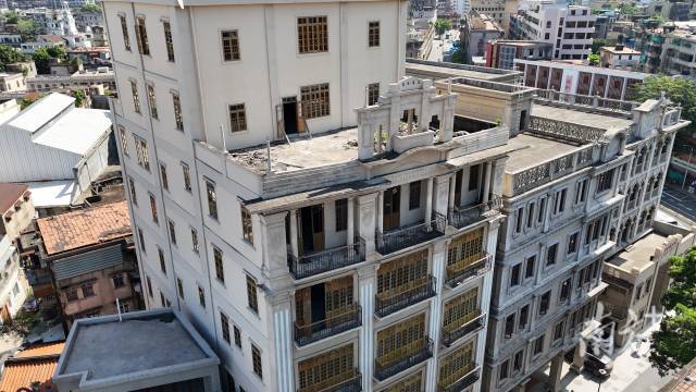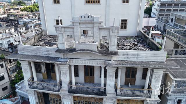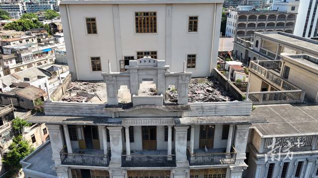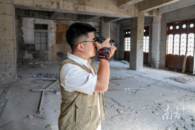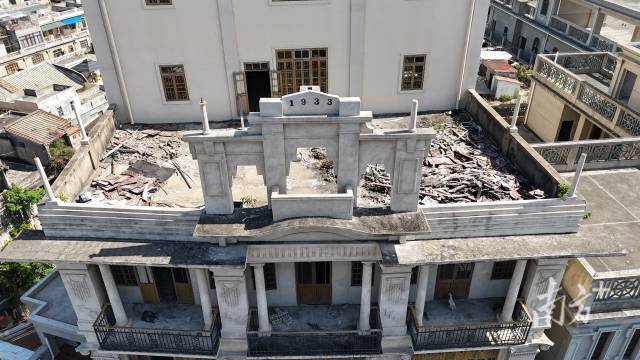 年輕的隊(duì)員們掏出了“新工具”——無人機(jī)。在航拍下,自稱“文保新生”的盧孟羽發(fā)現(xiàn),汕頭大廈舊址頂樓的白色牌坊上,刻著代表出生年份的數(shù)字“1933”。這張全新角度的照片順利補(bǔ)充進(jìn)了檔案里。