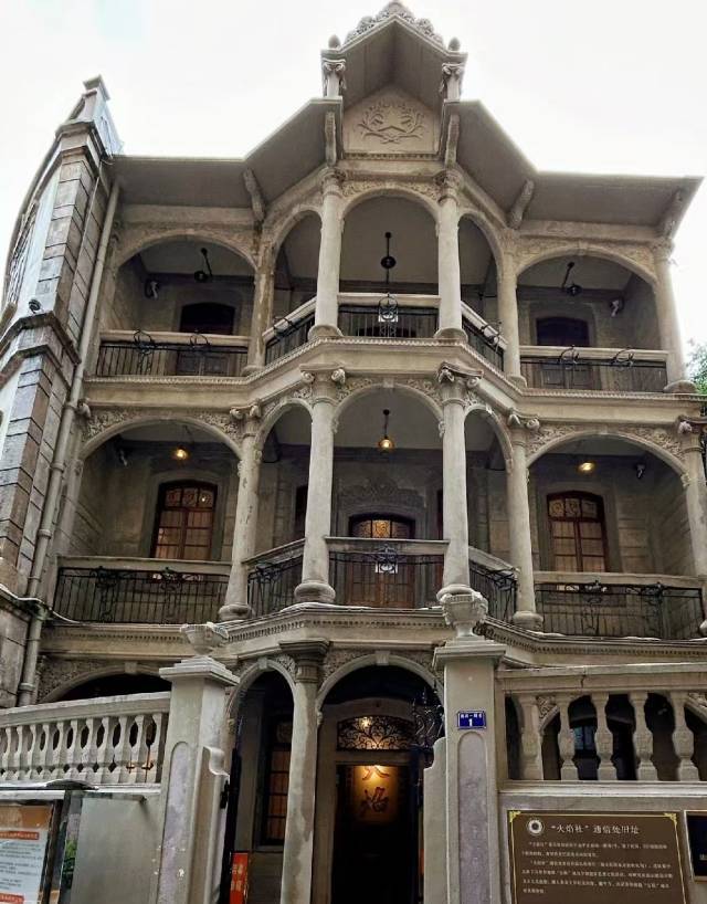 沿街看平平無奇,轉(zhuǎn)入內(nèi)街,只見一段石墻,將一棟三層仿巴洛克式建筑半圍起來,里邊的小洋樓十分別致,灰白羅馬石柱、別致的拱型門廊、精美絕倫的浮雕……透著不同尋常的訊息。