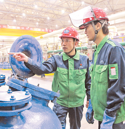 潘從明(左)在指導班組成員操作設備。 本報記者 趙帥杰攝