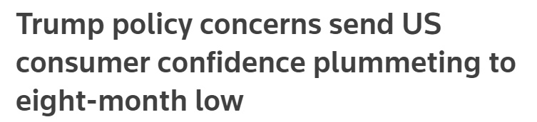報道稱,特朗普是因為向美國人承諾會降低通脹和物價才當選總統(tǒng)的。在他獲勝后,美國企業(yè)和消費者信心曾一度飆升。但他在上任后的僅僅一個月內(nèi)就宣布了連串加征關(guān)稅計劃,從而“導致美國消費者信心暴跌至八個月以來的最低點”。