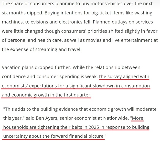 報告警告,如果美國消費者信心繼續(xù)下滑,可能會顯著影響他們的消費模式,在未來幾個月減緩經(jīng)濟增長。