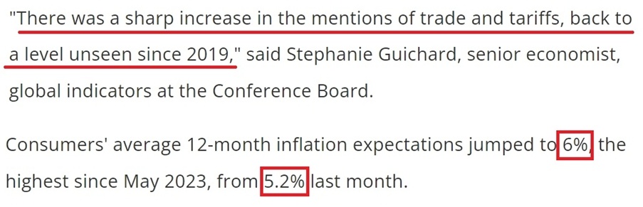 在美國CCI以三年半以來的最大速度惡化的同時,美國消費者對未來一年的通脹預期也從5.2%大幅升高至6%,達到2023年5月以來的最高水平。這進一步顯示,美國人對特朗普政府政策可能對經(jīng)濟造成的負面影響越來越擔憂。