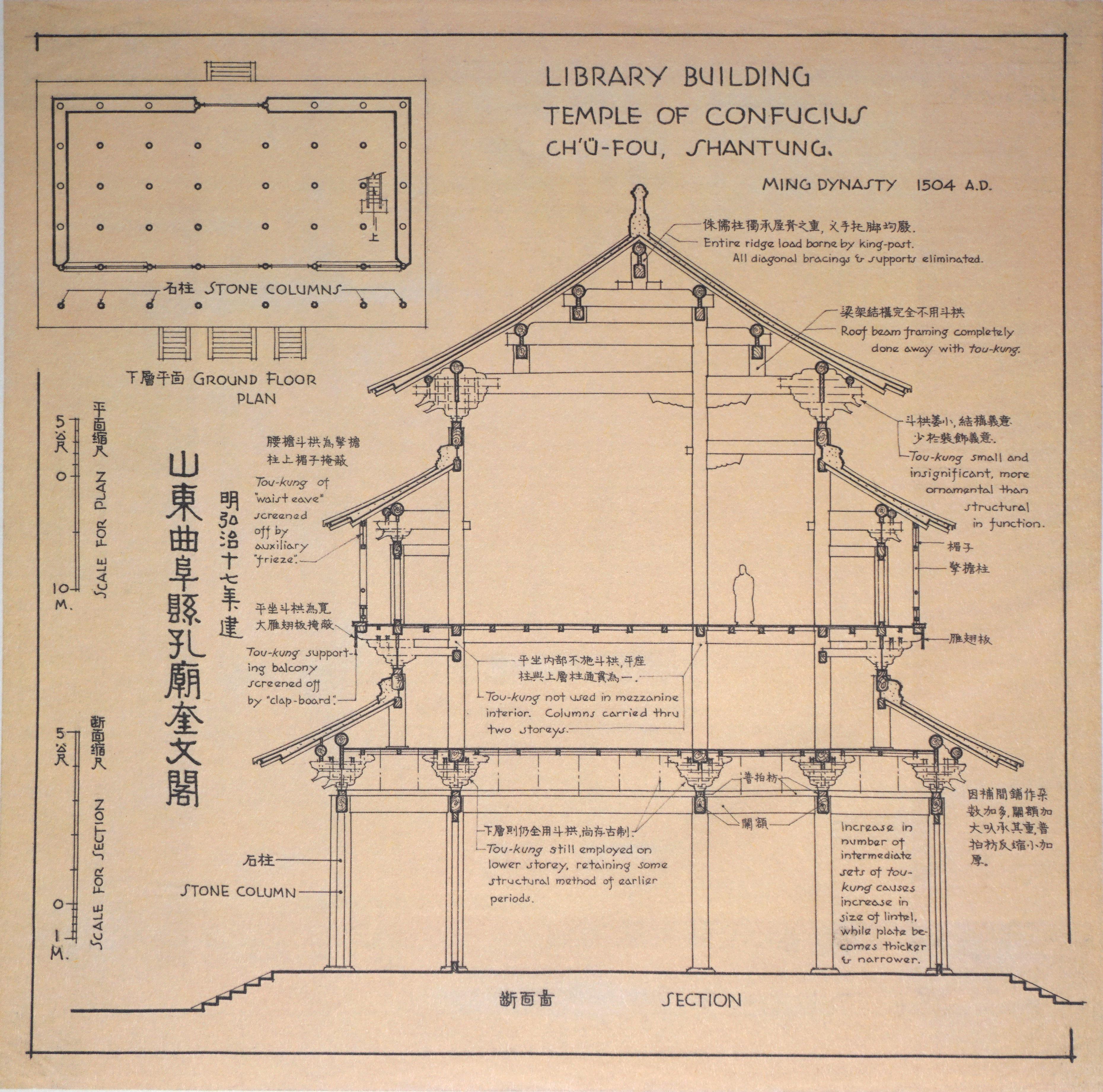 △奎文閣藏書(shū) 這座木構(gòu)樓閣 外觀看上去為兩層 其實(shí)兩明層間夾有暗層 實(shí)為三層 同時(shí),它的下層柱高度相同 而上層內(nèi)外柱不同高 柱、梁、額相互交織 造就了它穩(wěn)定堅(jiān)固的特點(diǎn)