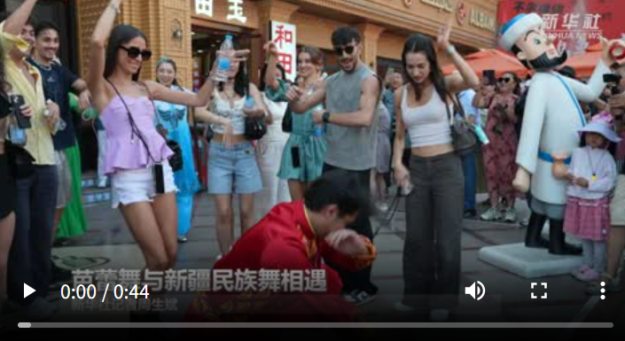 7月22日,第七屆中國新疆國際民族舞蹈節(jié)間隙,意大利米蘭芭蕾舞團成員來到位于烏魯木齊的新疆國際大巴扎參觀游覽。在看到新疆民族舞蹈演員精彩表演后,意大利演員們跳起了芭蕾舞《羅密歐與朱麗葉》片段,令在場各地游客和觀眾大飽眼福。