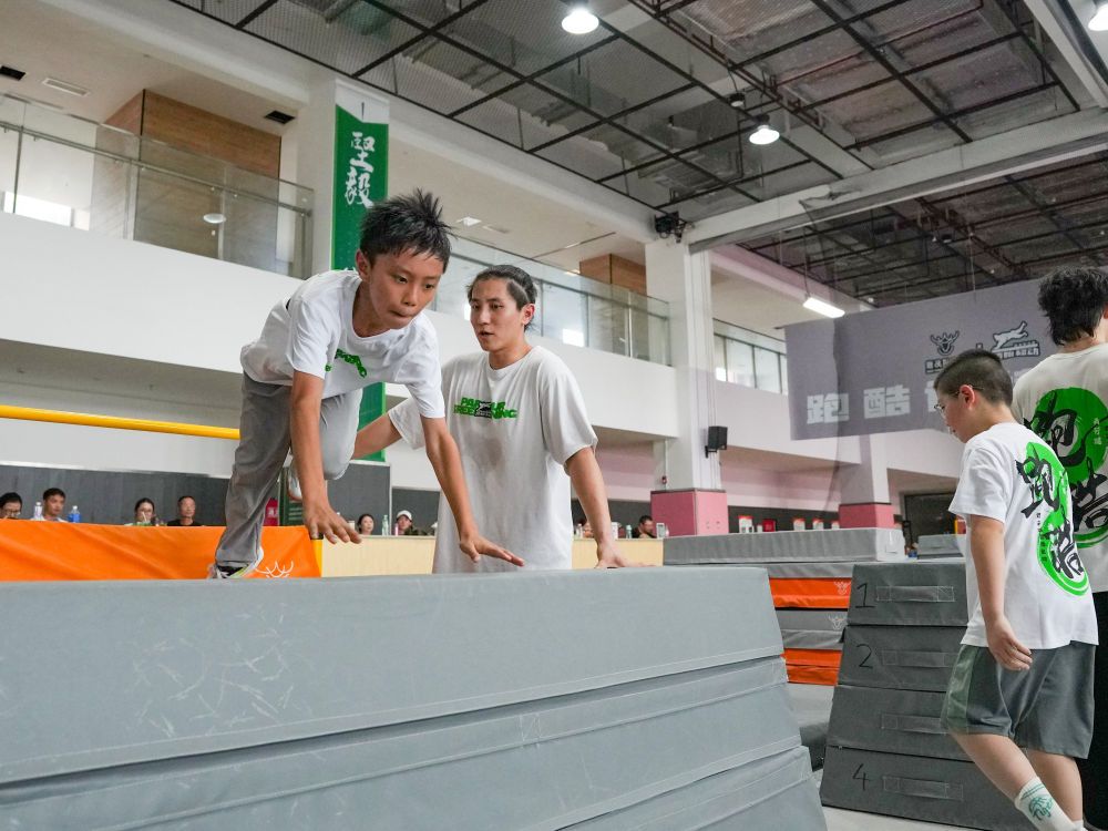 8月5日,在成都一家跑酷訓(xùn)練基地,小朋友在練習(xí)跑酷。新華社記者 王曦 攝
