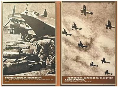 中國(guó)人民抗日戰(zhàn)爭(zhēng)紀(jì)念館中展示的蘇聯(lián)援華航空隊(duì)老照片。左側(cè)照片為蘇聯(lián)援華航空隊(duì)成員為飛機(jī)裝彈,準(zhǔn)備轟炸被日軍占領(lǐng)的臺(tái)北松山機(jī)場(chǎng)。右側(cè)照片為1938年中蘇空軍參加徐州會(huì)戰(zhàn)。