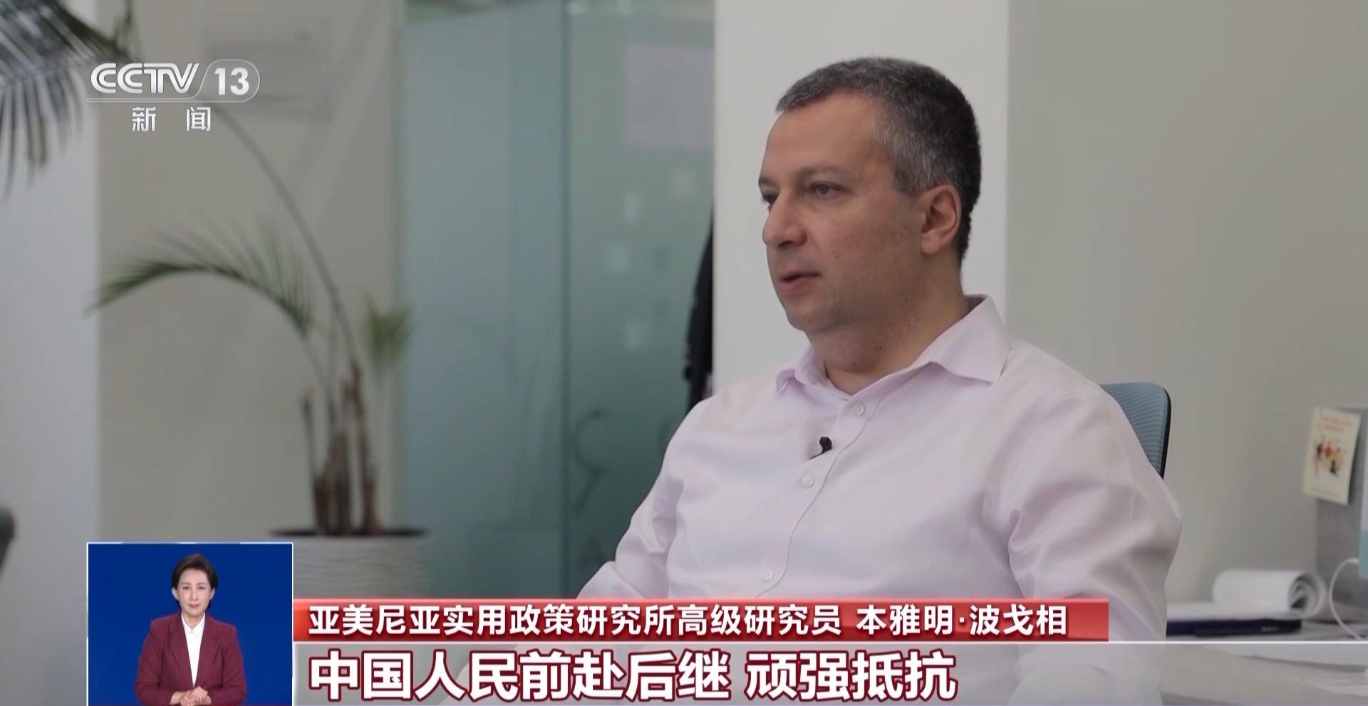 亞美尼亞實用政策研究所高級研究員 本雅明·波戈相:自20世紀30年代初起,中國就展開了艱苦卓絕的抗日戰(zhàn)爭。中國人民前赴后繼、頑強抵抗、付出巨大犧牲,為人類最終戰(zhàn)勝法西斯勢力作出不可磨滅的貢獻。我們應當永遠銘記中國和反法西斯同盟國取得的偉大勝利,歷史不僅需要被銘記,更需要從中汲取教訓。