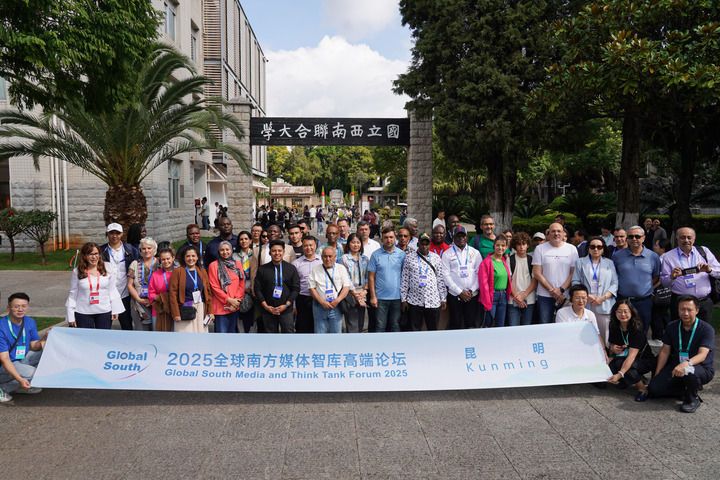 9月5日,出席"全球南方"媒體智庫高端論壇的代表在西南聯(lián)大舊址前合影留念。西南聯(lián)大舊址位于云南師范大學(xué)校園內(nèi)。新華社記者 辛夢晨 攝