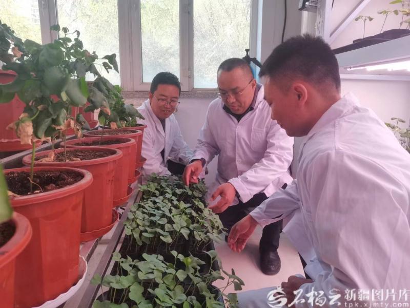 新疆農(nóng)科院經(jīng)濟(jì)作物研究所棉花分子育種創(chuàng)新團(tuán)隊鄭巨云研究員(中)與團(tuán)隊成員一起開展棉花耐低溫材料鑒定評價。圖/自治區(qū)農(nóng)科院(資料圖)