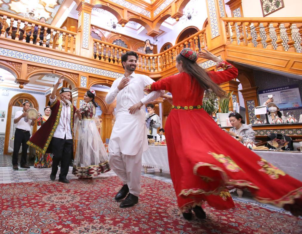 2025年9月10日,來自巴基斯坦的游客韓帥(前右二)在新疆喀什古城景區(qū)“古麗的家”民宿與工作人員跳舞??κ补懦蔷皡^(qū)歷史底蘊深厚,2025年1至7月,接待游客達1668.6萬人次,實現(xiàn)旅游綜合收入74.7億元。新華社記者 程麗 攝