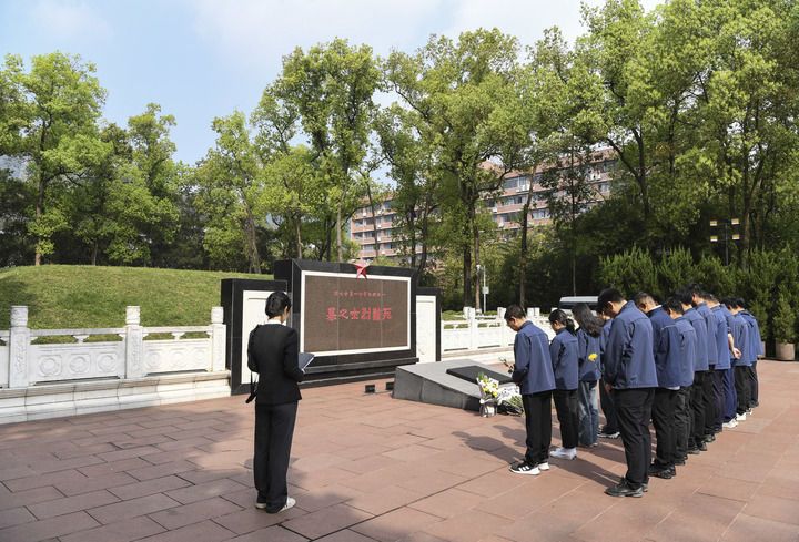 中鐵建工集團(tuán)重慶東站項(xiàng)目部職工在重慶歌樂(lè)山烈士陵園緬懷革命先烈(2024年3月28日攝)。新華社記者 王全超 攝