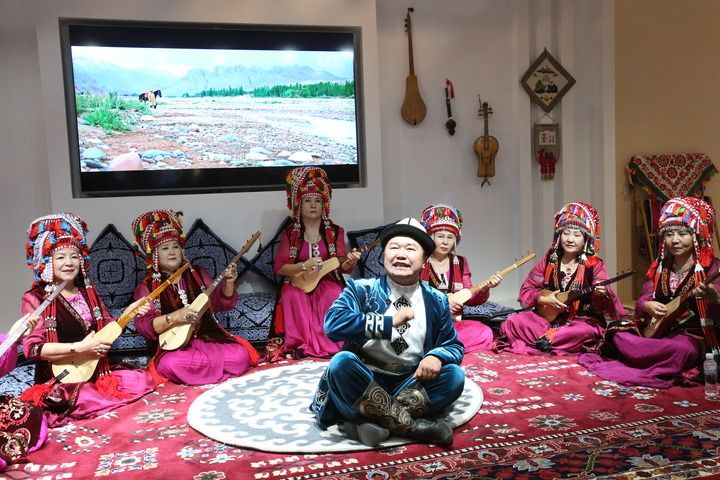 在新疆克孜勒蘇柯?tīng)柨俗巫灾沃莅D什市,《瑪納斯》州級(jí)代表性傳承人鐵力瓦爾地·白先那洪表演《瑪納斯》(2025年9月12日攝)。新華社記者 程麗 攝