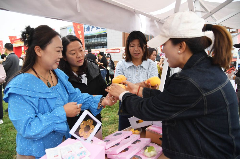 9月19日,北京市平谷區(qū)舉辦2025年中國(guó)農(nóng)民豐收節(jié)暨第36屆北京農(nóng)民藝術(shù)節(jié)"鄉(xiāng)村大舞臺(tái)"平谷區(qū)專(zhuān)場(chǎng)展演。工作人員(右一)在活動(dòng)現(xiàn)場(chǎng)向市民介紹農(nóng)產(chǎn)品。新華社記者 任超 攝
