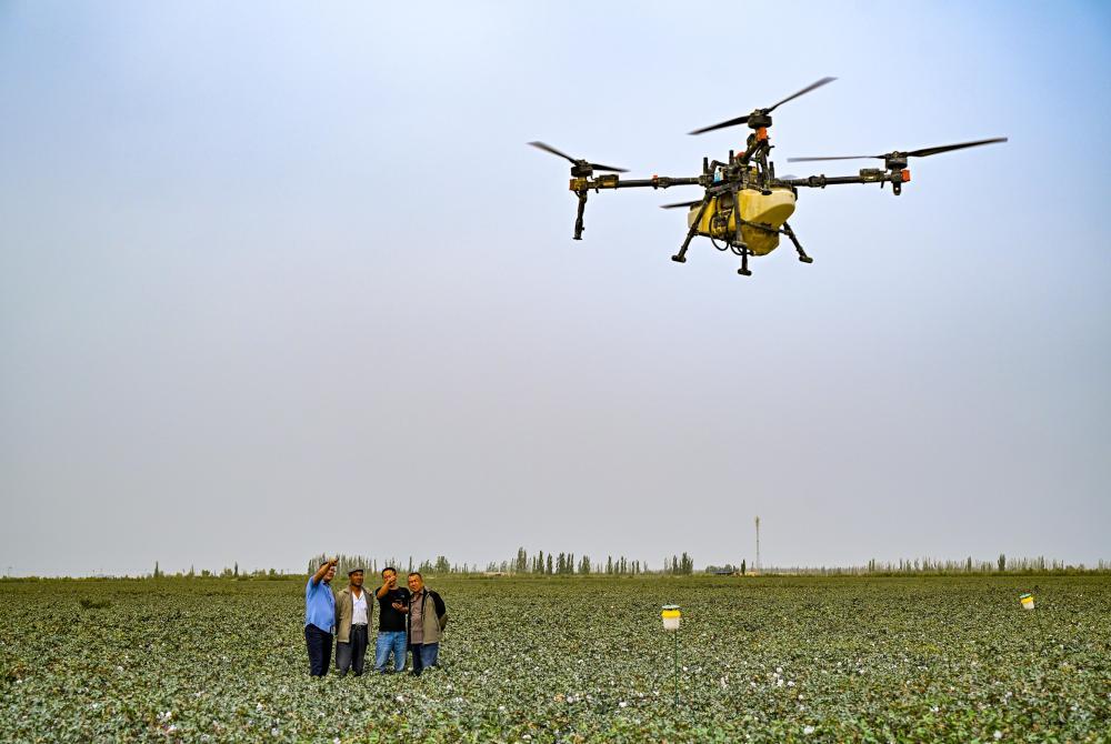 9月19日,極飛超級(jí)棉田負(fù)責(zé)人艾海鵬(右二)在尉犁縣的示范棉田里為達(dá)西村村民進(jìn)行智能無(wú)人機(jī)灑藥培訓(xùn)。無(wú)人化智慧農(nóng)場(chǎng)應(yīng)用農(nóng)業(yè)無(wú)人機(jī)、農(nóng)業(yè)無(wú)人車、遙感無(wú)人機(jī)、農(nóng)機(jī)自駕儀等系列物聯(lián)設(shè)備實(shí)施"水肥一體化"管理,農(nóng)民用一部手機(jī)即可操作智能設(shè)備完成多項(xiàng)田間管理工作。