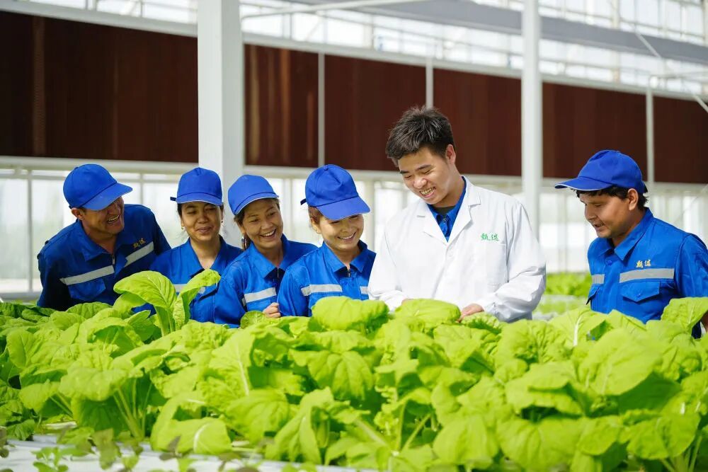 在新疆阿克蘇地區(qū)庫(kù)車市甬庫(kù)同心村智慧農(nóng)業(yè)植物工廠,技術(shù)人員在培訓(xùn)當(dāng)?shù)氐霓r(nóng)業(yè)產(chǎn)業(yè)工人。