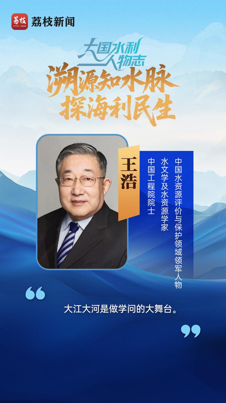 王浩長期從事水文水資源研究。1989年從清華大學(xué)水利系畢業(yè)后,進入中國水科院水資源所工作。數(shù)十年的科研生涯中,他經(jīng)常一年200多天出差在外,幾乎跑遍中國所有的河流湖泊,對每一個水域的情況都了如指掌。他創(chuàng)新研發(fā)的多項應(yīng)用技術(shù)在水利、環(huán)保、林業(yè)等部門得到了廣泛應(yīng)用,有力支撐著南水北調(diào)工程、三峽工程等規(guī)劃與調(diào)度運行。他建立了水平衡的海綿城市建設(shè)系統(tǒng)科學(xué)范式。如今,70余歲的王浩正在推動建設(shè)國家水網(wǎng)工程。